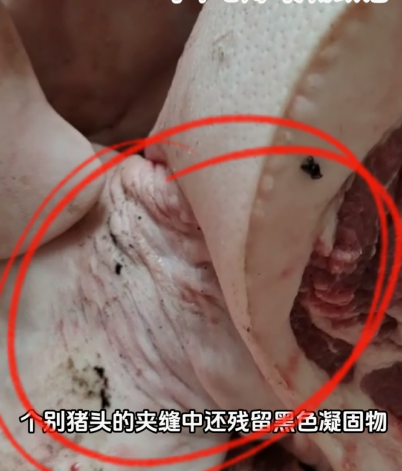 只见店内大量洗净的猪头泡在盆里或堆放在案头,仔细观察发现个别猪头肉夹缝中残留有颗粒状黑色凝固物。