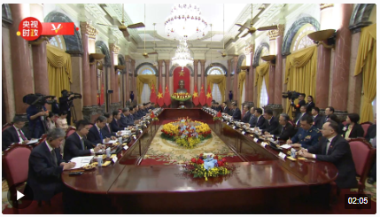 当地时间12月13日上午,中共中央总书记、国家主席习近平在河内主席府同越南国家主席武文赏举行会谈。
