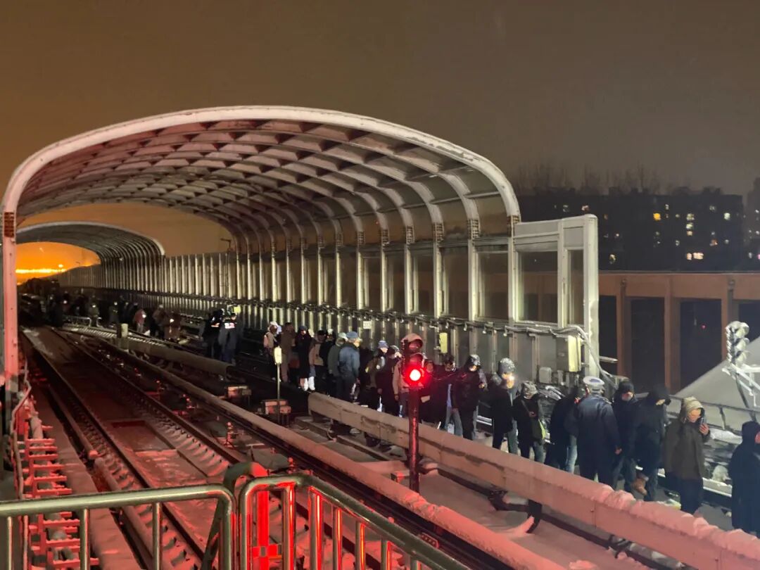 目前,正在进行人员疏散,疏散乘客正在陆续到达西二旗站,现场已准备保暖及救助物品。