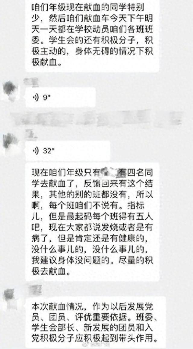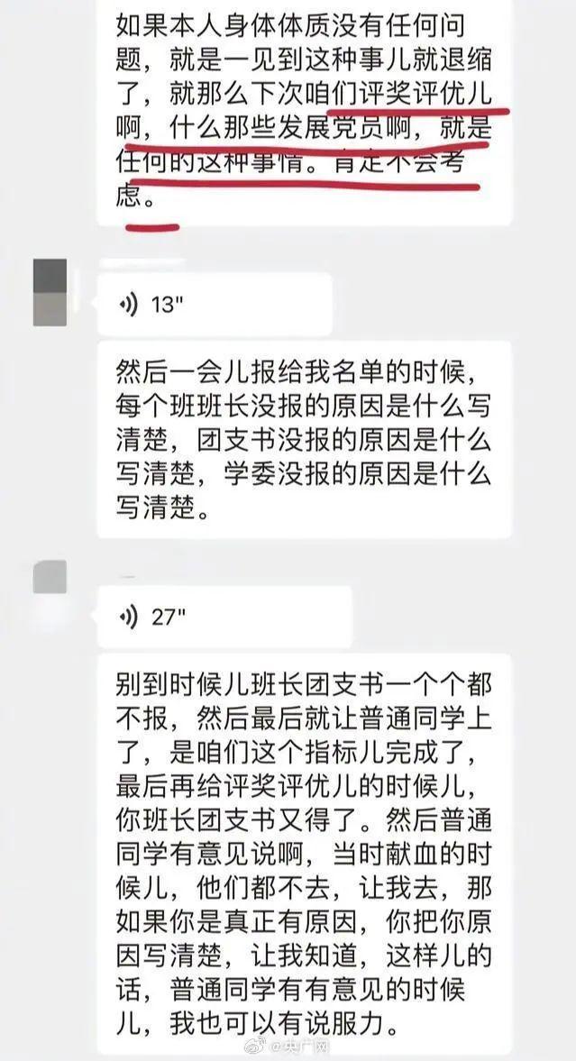 网传的数张微信截图中,一名疑似辅导员的工作人员在学生群中发布消息称:“每个班必须有5人以上献血。” 聊天记录显示,此人发布多条催促献血的消息,并称“班委带头不交,直接撤掉,一年内评奖评优积极分子均不考虑” “如果这种事退缩了,那么评优……任何事都不会考虑。”