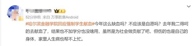 12月13日,哈尔滨金融学院一名工作人员称,学校动员班级干部、积极分子献血是希望起到带头作用,发挥模范作用,没有强制。献血是自愿的,学生不献血对评优等方面也没有影响。至于疑似辅导员在学生群中发布的内容,该工作人员称,学校还在了解中。