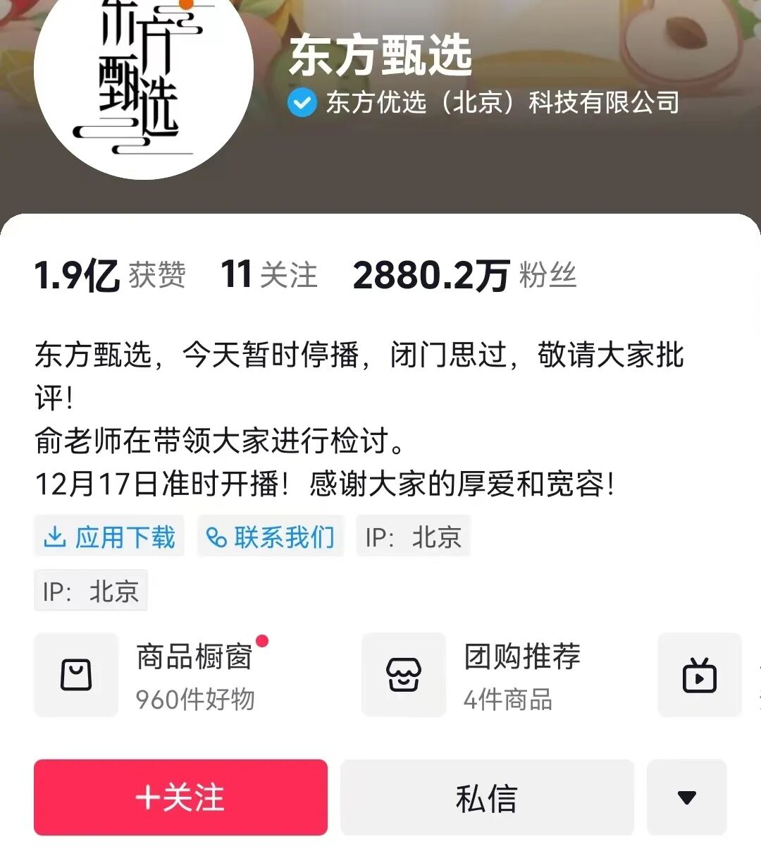 12月16日凌晨,东方甄选官方抖音账号更新简介,宣布当天暂时停播,闭门思过,敬请大家批评!俞老师在带领大家进行检讨。12月17日准时开播,感谢大家的厚爱和宽容!