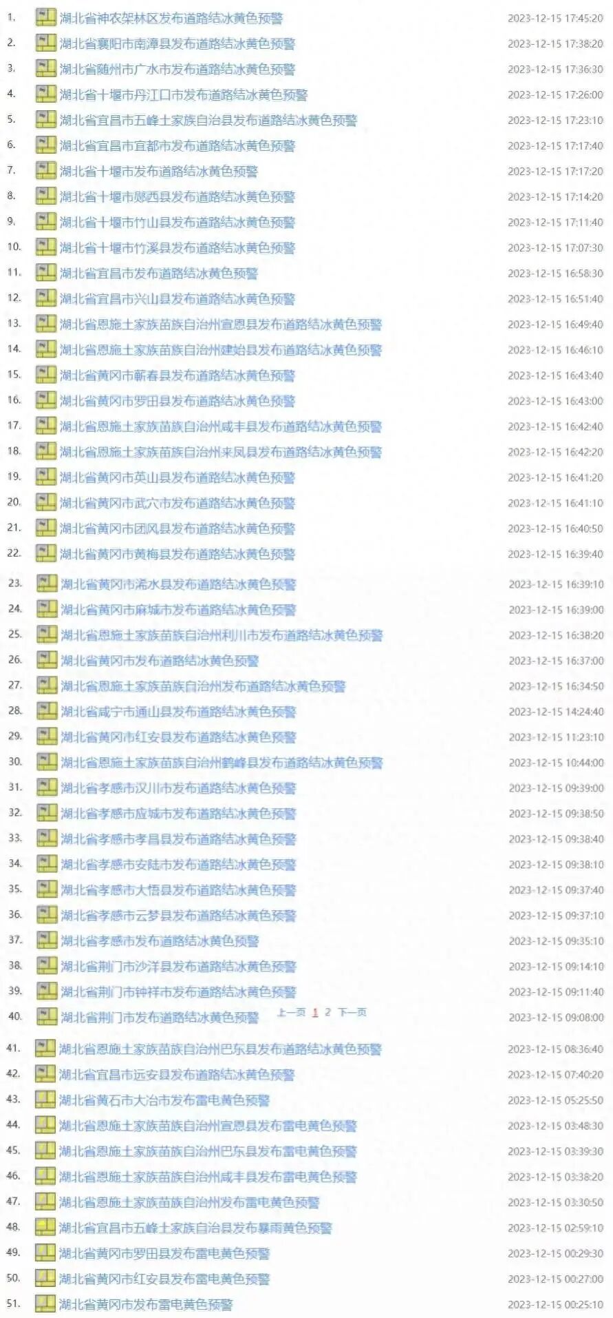 12月15日湖北接连发布多条道路结冰、雷电、暴雨预警