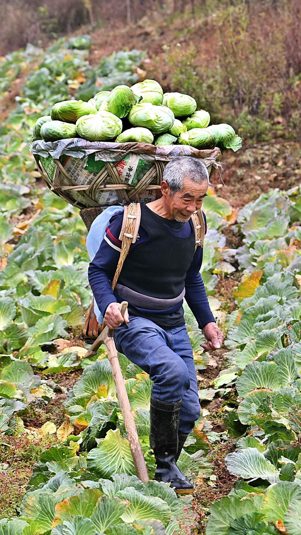 村民正在把刚刚采摘的包菜背下山。(湖北日报全媒记者 朱熙勇 摄)