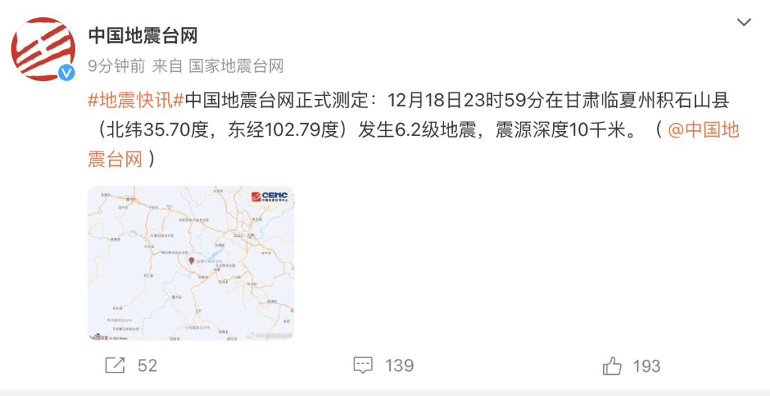 据中国地震台网测定,2023年12月18日23时59分在甘肃临夏州积石山县(北纬35.70度,东经102.79度)发生6.2级地震,震源深度10公里。