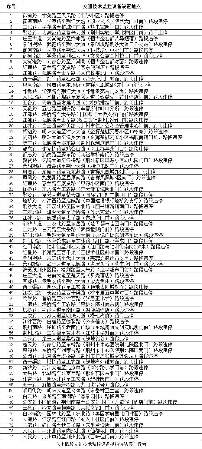 抓拍道路交通违法行为为加强道路交通安全管理,预防和减少道路交通事故,根据《行政处罚法》《道路交通安全法》等法律法规规定,荆州市公安局交通管理局将于2024年1月18日零时启用部分新增电子监控设备,用于抓拍道路交通违法行为,现将相关设置地点向社会公布,请广大市民自觉遵守交通法规,安全文明出行。