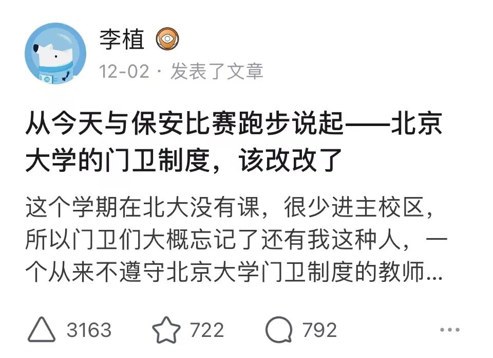 “北大的这种门卫管理制度给师生造成了很大不便,上下班高峰时,北大东门的闸机前常常排起长队。门口执勤的保安都很辛苦,但是这种严防死守的模式不适用于大学,我们真正希望看到的保安应当更关注校内公共场所,而不是站在门口。尤其是连出门也要管,毫无必要。”李植在文中写道。