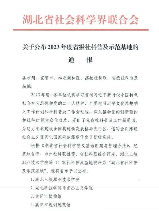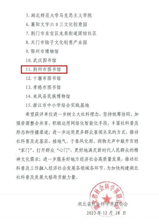 近期,根据《湖北省社会科学普及基地创建与管理办法》,经基地自评、市州社科联推荐、省社科联综合评定,荆州市图书馆等15家社科普及基地被评为“湖北省社科普及示范基地”。