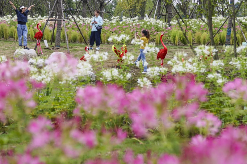 市民游客在临江仙公园醉蝶花丛中拍照打卡