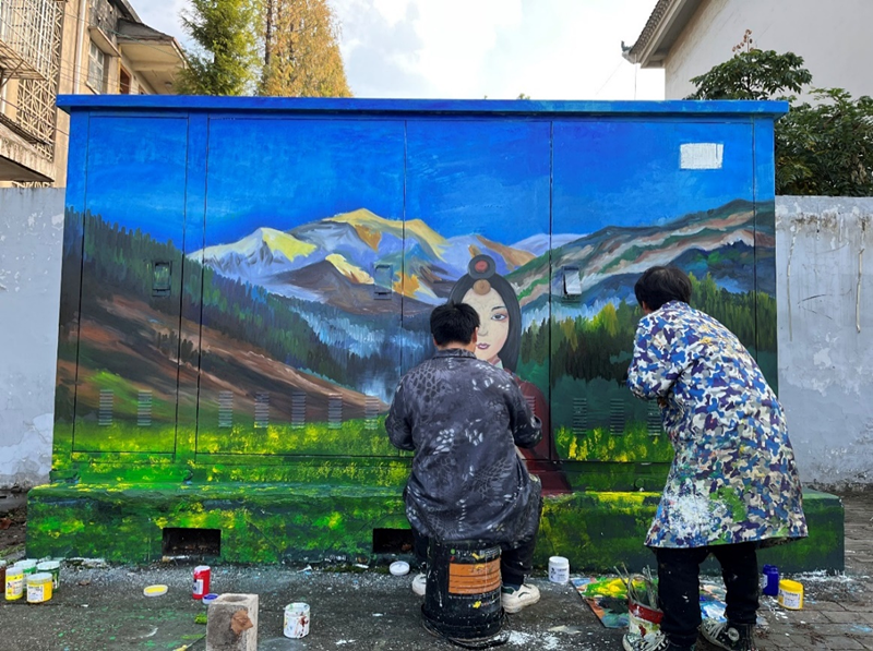 施工人员正在对电力柜进行手工彩绘