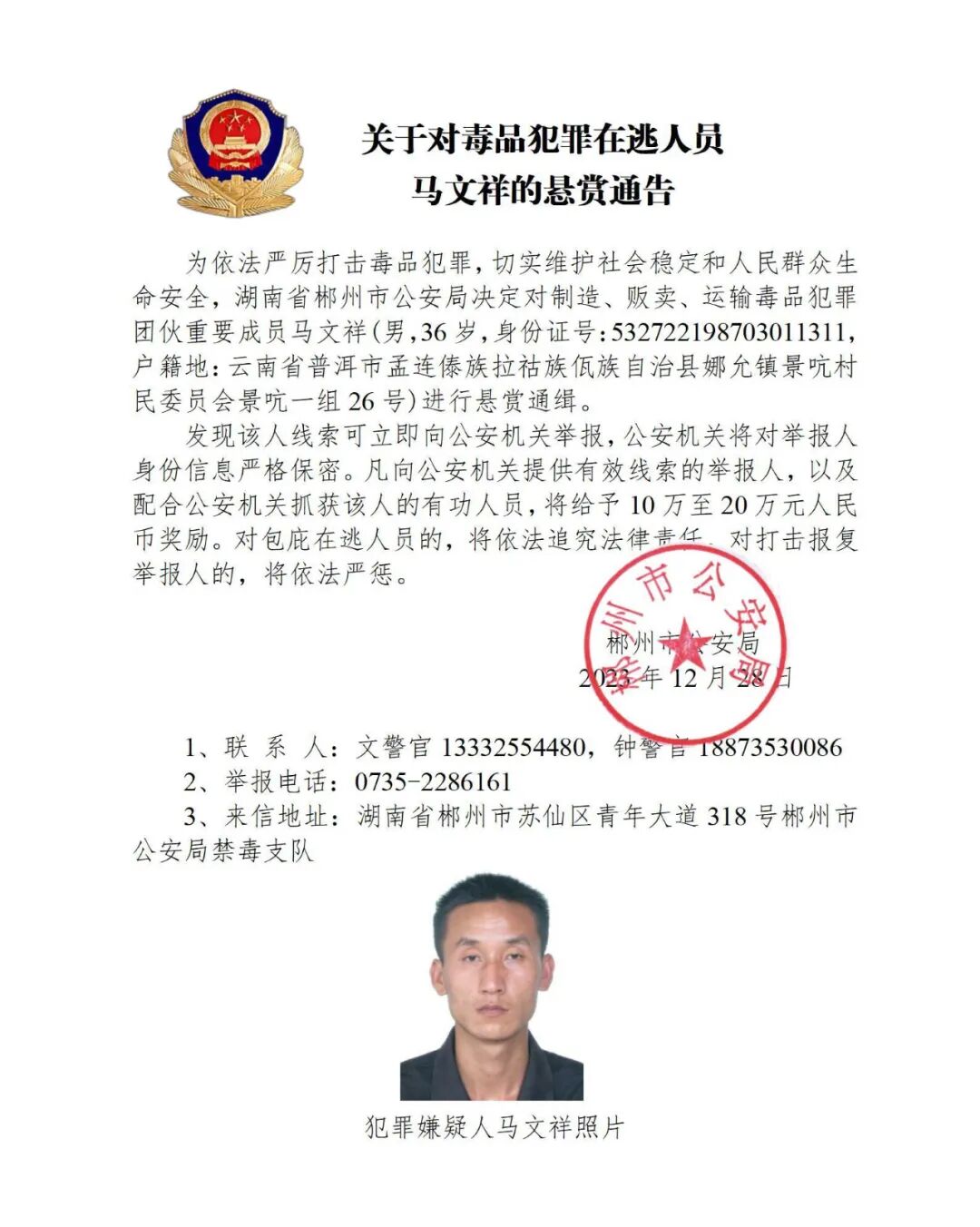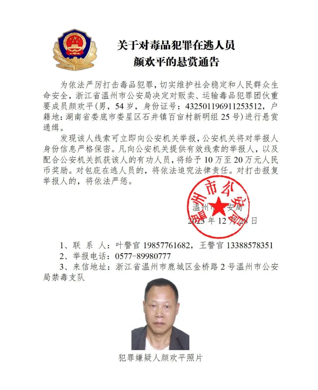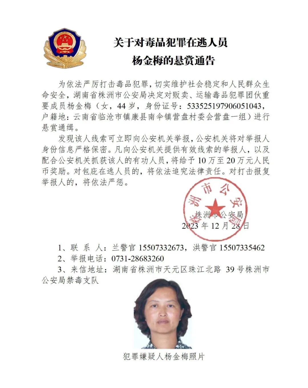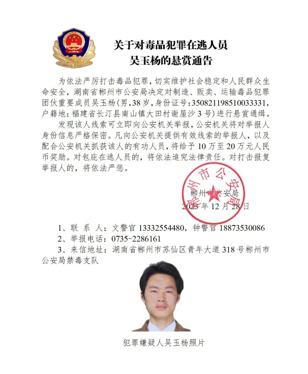 其中,湖南省郴州市公安局决定对张安龙、马文祥、吴玉杨进行公开悬赏通缉;湖南省株洲市公安局决定对杨金梅进行公开悬赏通缉;江西省新干县公安局决定对曾小勇、李国平、孙强进行公开悬赏通缉;浙江省温州市公安局决定对颜欢平进行公开悬赏通缉;四川省遂宁市公安局决定对母朝东进行公开悬赏通缉;贵州省黔东南州公安局决定对龙华进行公开悬赏通缉。