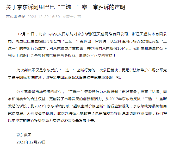 12月29日,京东集团发布关于京东诉阿里巴巴“二选一”案一审胜诉的声明,其中提出,12月29日,北京市高级人民法院对京东诉浙江天猫网络有限公司、浙江天猫技术有限公司、阿里巴巴集团控股有限公司“二选一”案做出一审判决,认定其滥用市场支配地位实施“二选一”的垄断行为成立,对京东造成严重损害,并判决向京东赔偿10亿元。