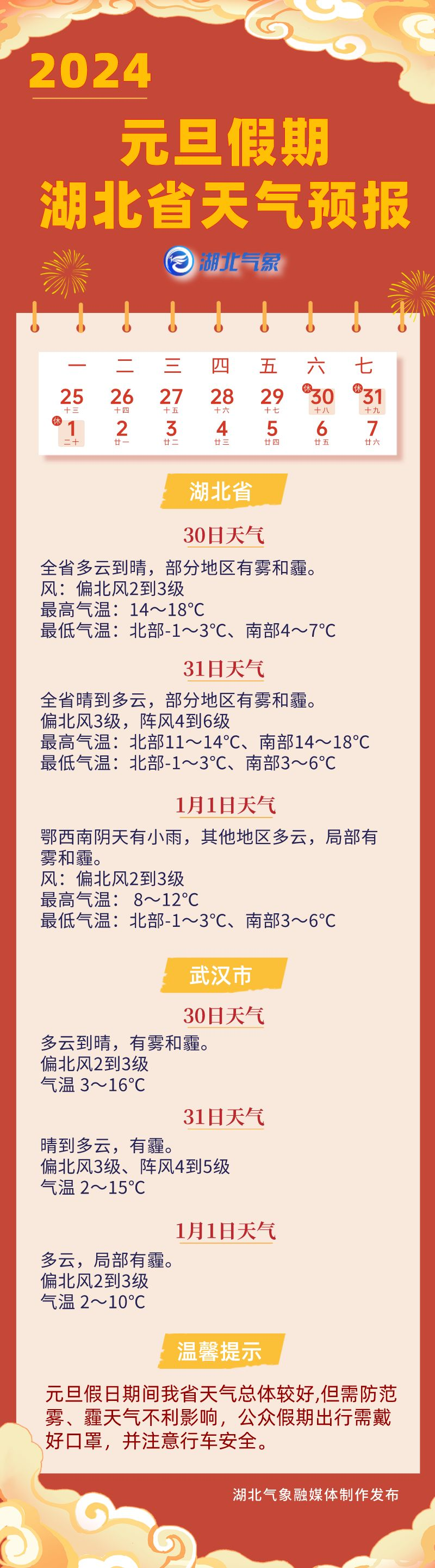同时,未来几天湖北持续有雾和霾天气过程,部分时段能见度较低,恰逢元旦假期出行高峰期,大家需关注最新预报、预警及交通信息,做好出行计划,以免耽误行程;