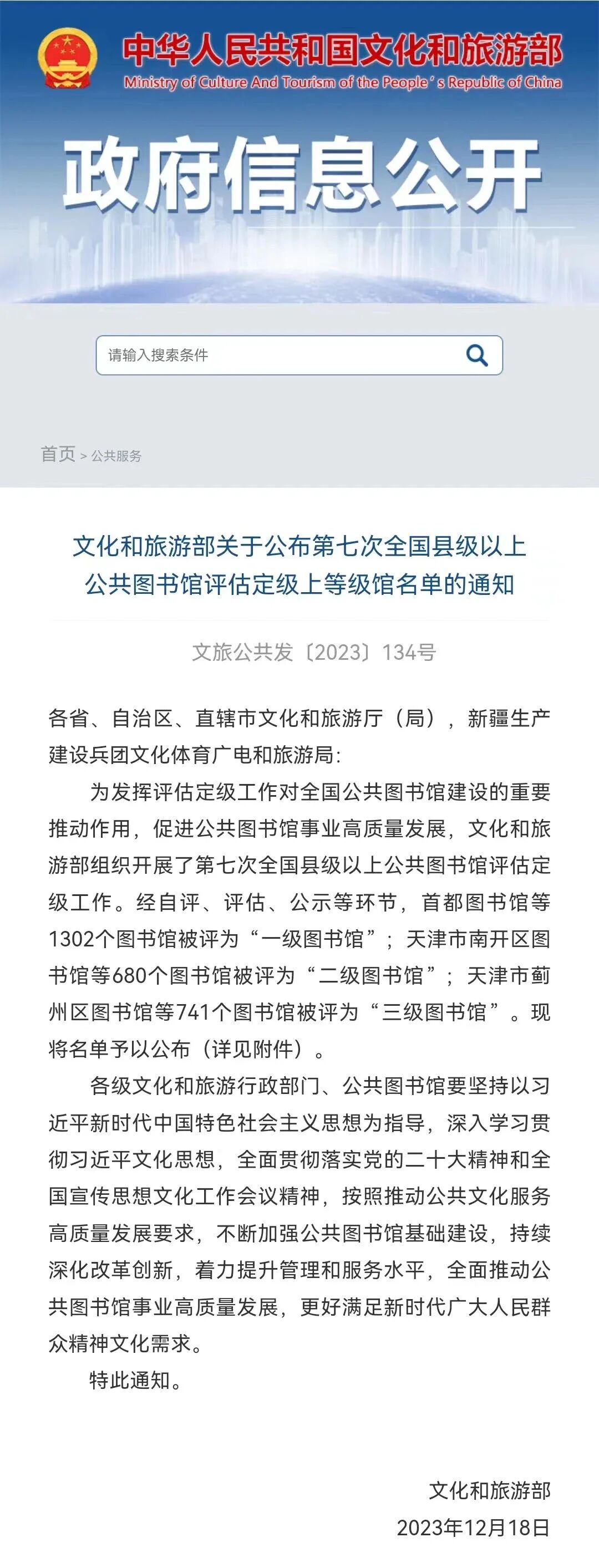 据悉,文化和旅游部每四年对全国县级以上公共图书馆开展评估定级工作,这不仅是对公共图书馆建设和服务工作的全面评价和考核,也是对地方政府在公共图书馆运行条件和服务保障方面的考评。