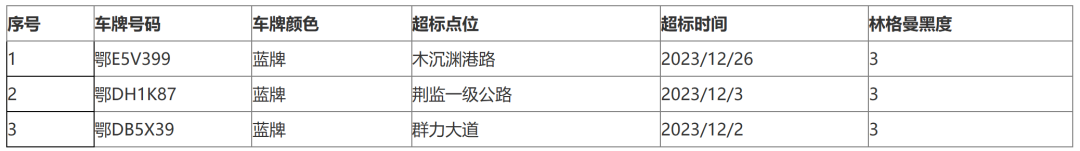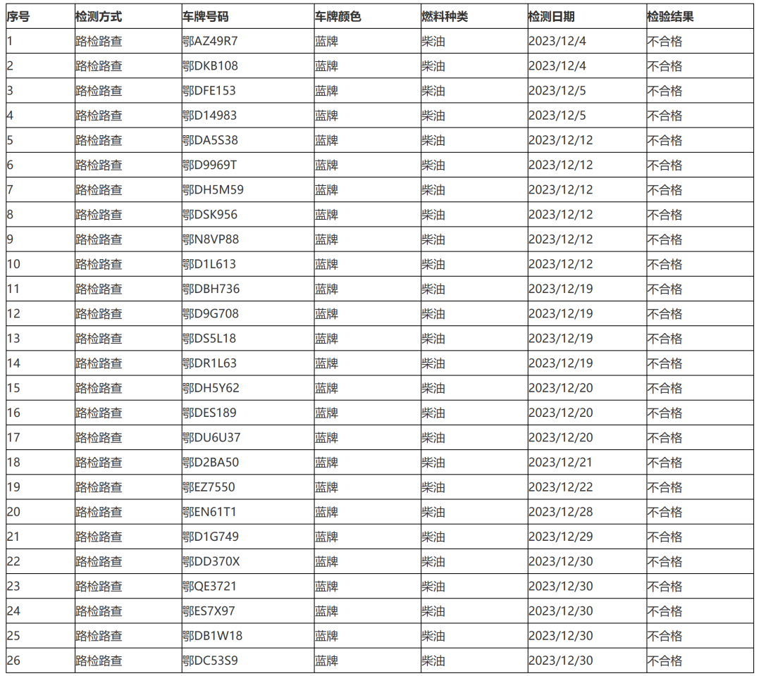 2023年12月1日至12月31日,根据荆州市黑烟车抓拍和遥感监测设备数据显示以及生态环境部门、公安交管部门联合开展的路检路查工作,发现部分车辆尾气排放不合格,具体名单附后。