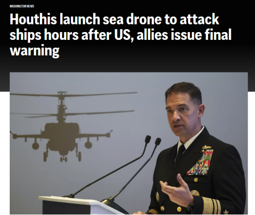 据美联社1月5日报道,4日,胡塞武装发射的一艘武装水上无人艇在距离商船和美国部署在红海的军舰只有“数英里”的位置爆炸。而就在这艘无人艇爆炸的数个小时前,美国联合12国向胡塞武装发出了最后通牒,要求该组织停止袭击,否则将遭到军事打击。