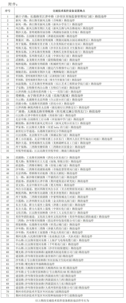 为加强道路交通安全管理,预防和减少道路交通事故,按照《行政处罚法》《道路交通安全法》等法律法规规定,荆州市公安局交通管理局将于2024年2月1日零时启用部分新增电子监控设备,用于抓拍道路交通违法行为。现将相关设置地点向社会公布,请广大市民自觉遵守道路交通安全法律法规,安全文明出行。
