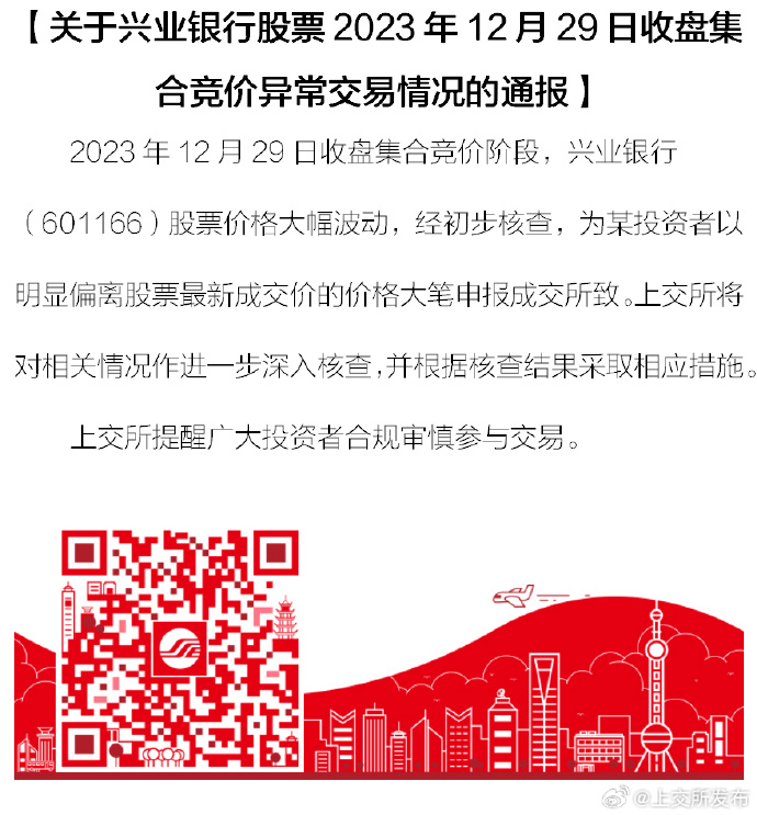 当日,上交所称,经初步核查,2023年12月29日收盘集合竞价阶段兴业银行股票价格大幅波动的原因为某投资者以明显偏离股票最新成交价的价格大笔申报成交所致。上交所将对相关情况作进一步深入核查,并根据核查结果采取相应措施。