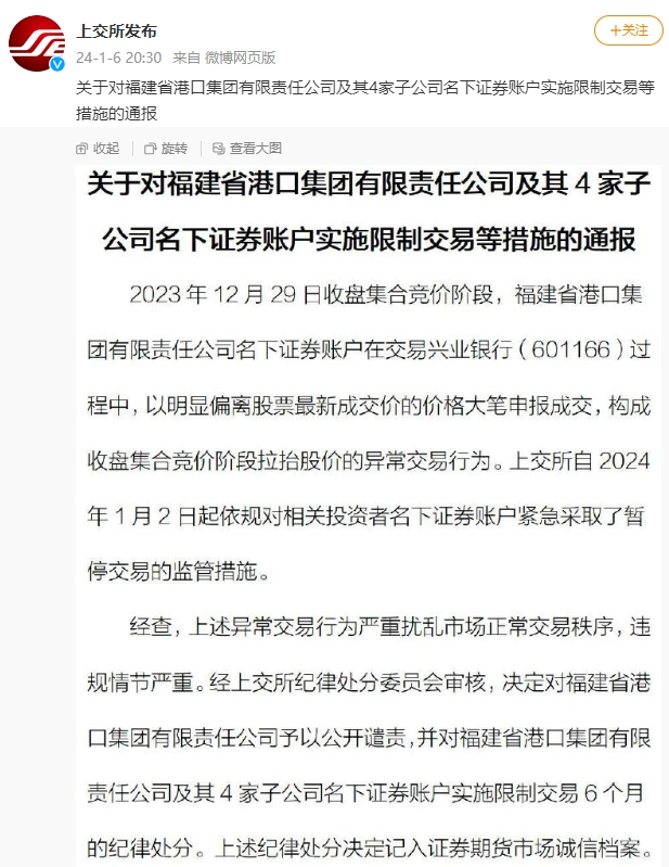 在当日宣布将对相关情况作进一步深入核查后,1月6日晚,上交所再次发布通报称,福建省港口集团有限责任公司名下证券账户在交易兴业银行过程中构成收盘集合竞价阶段拉抬股价的异常交易行为,决定对福建省港口集团有限责任公司及其四家子公司名下证券账户实施限制交易6个月的纪律处分。据悉,这是一般情况下交易所层面对异常交易行为做出的顶格纪律处分决定。