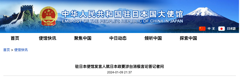 驻日本使馆发言人就日本政要涉台消极言论答记者问
