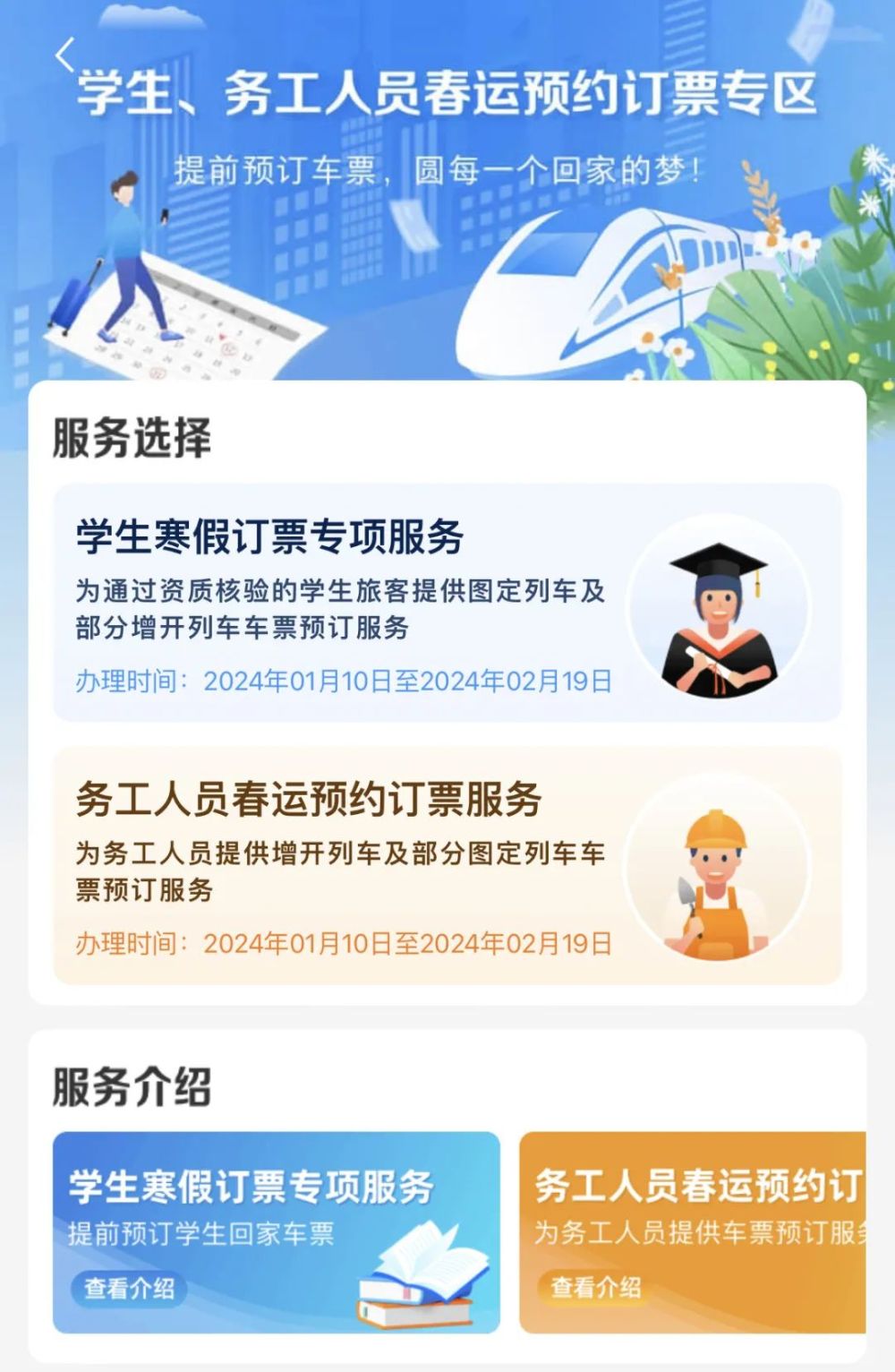 为认真贯彻落实党中央国务院关于做好2024年元旦春节期间有关工作的要求,保障学生、务工人员等重点群体春运出行,铁路12306创新服务举措,为学生、务工人员推出了售票服务专区。自1月10日起,符合条件的学生旅客(已通过学生优惠资质核验且有剩余优惠乘车次数)可通过“学生寒假订票专项服务”专区预约购买春运期间(1月26日至3月5日)火车票,每名旅客最多可同时提交6个预约订单,每个订单可添加1个乘车日期的20个“车次+席别”的组合,可选席别为学生优惠票适用的硬座、硬卧、二等座。已通过实名制核验的务工人员可通过“务工人员春运预约订票服务”专区预约购买春运期间火车票,每名旅客可同时提交6个预约订单,每个订单可选择“时间+车次+席别”的1个组合。