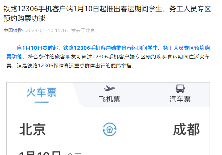 自1月10日零时起,铁路12306手机客户端推出春运期间学生、务工人员专区预约购票功能,符合条件的旅客朋友可通过12306手机客户端专区预约购买春运期间往返火车票,这是铁路12306保障春运重点群体出行的便民举措。