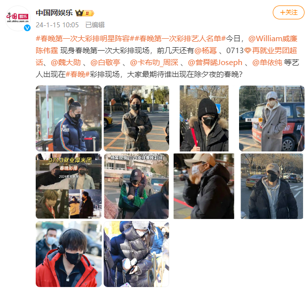 据报道,1月15日,陈伟霆、汪苏泷、张杰、章若楠、曾舜晞等人现身央视大楼,为2024龙年春晚做准备。