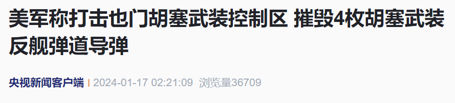 据央视消息,当地时间16日,美国中央司令部发表声明称,萨那当地时间16日上午4时15分,美军对也门胡塞武装控制区发动了袭击,摧毁了4枚准备自胡塞武装控制区发射的反舰弹道导弹。