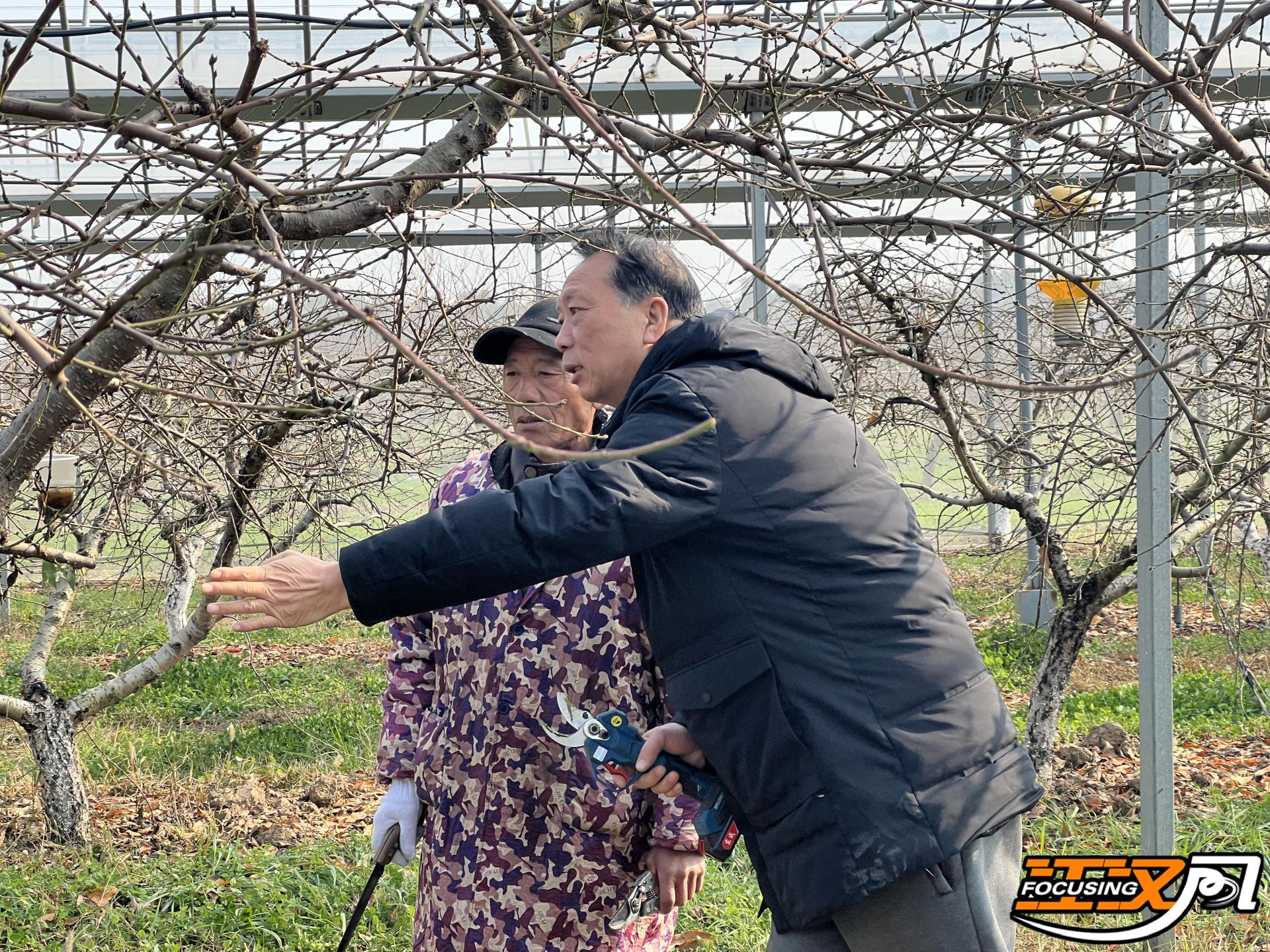 在江陵县三湖管理区,市级科技特派员刘子富正在为种植户讲解当季桃树剪枝的要点。科技特派员结合实际,教授种植户利用四季修剪、改施有机肥等方式,提高黄桃产量和品质。
