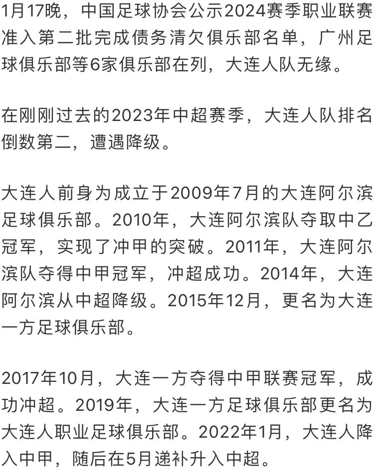 大连人俱乐部在公告中表示,虽经多方努力,因历史债务无法化解,俱乐部无法正常运营,最终未能通过2024赛季联赛准入。很遗憾不能继续共同征战绿茵场,在此对一直关心支持俱乐部的社会各界朋友,对一路风雨陪伴的广大球迷,深深再道一声感谢!化作春泥,再汇江海!