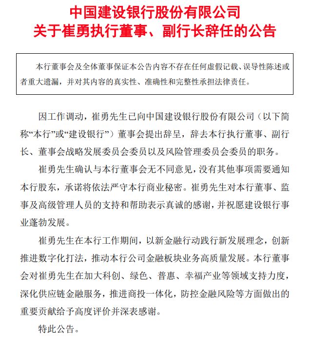 中国建设银行1月10日公告称,崔勇向该行提出辞呈,辞去该行执行董事、副行长、董事会战略发展委员会委员以及风险管理委员会委员的职务。建行提到,崔勇提出辞呈的原因是工作调动。