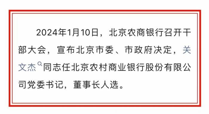 就在关文杰离开华夏银行后,他已成为北京农商银行董事长人选。北京农商银行官方微信公众号10日发文称,北京农商银行召开干部大会,宣布北京市委、市政府决定,关文杰任北京农村商业银行股份有限公司党委书记,董事长人选。