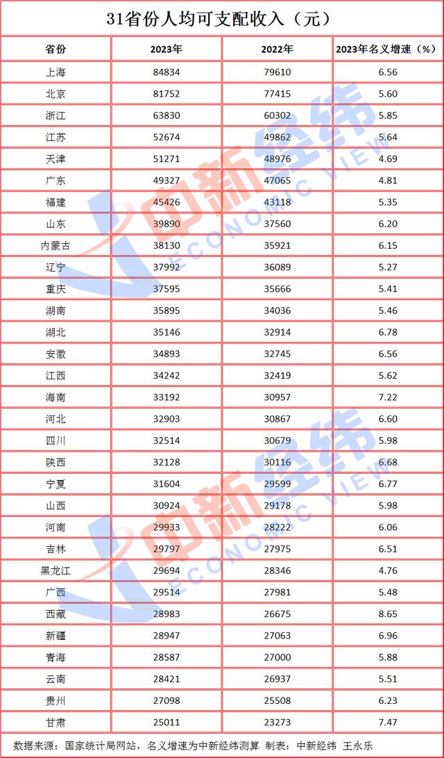 2023年31省份人均收入榜出炉。国家统计局19日公布的2023年居民人均可支配收入数据显示,上海、北京、浙江稳居前三,上海和北京更是携手首超8万元;西藏名义增速最高。你家乡排第几?所谓居民可支配收入,是指居民可用于最终消费支出和储蓄的总和,即居民可用于自由支配的收入,既包括现金收入,也包括实物收入。按照收入的来源,可支配收入包括工资性收入、经营净收入、财产净收入和转移净收入。京沪携手进入“8万+”苏津跻身“5万+”国家统计局数据显示,初步核算,2023年,国内生产总值1260582亿元,按不变价格计算,比上年增长5.2%;全国居民人均可支配收入39218元,比上年名义增长6.3%,扣除价格因素,实际增长6.1%。