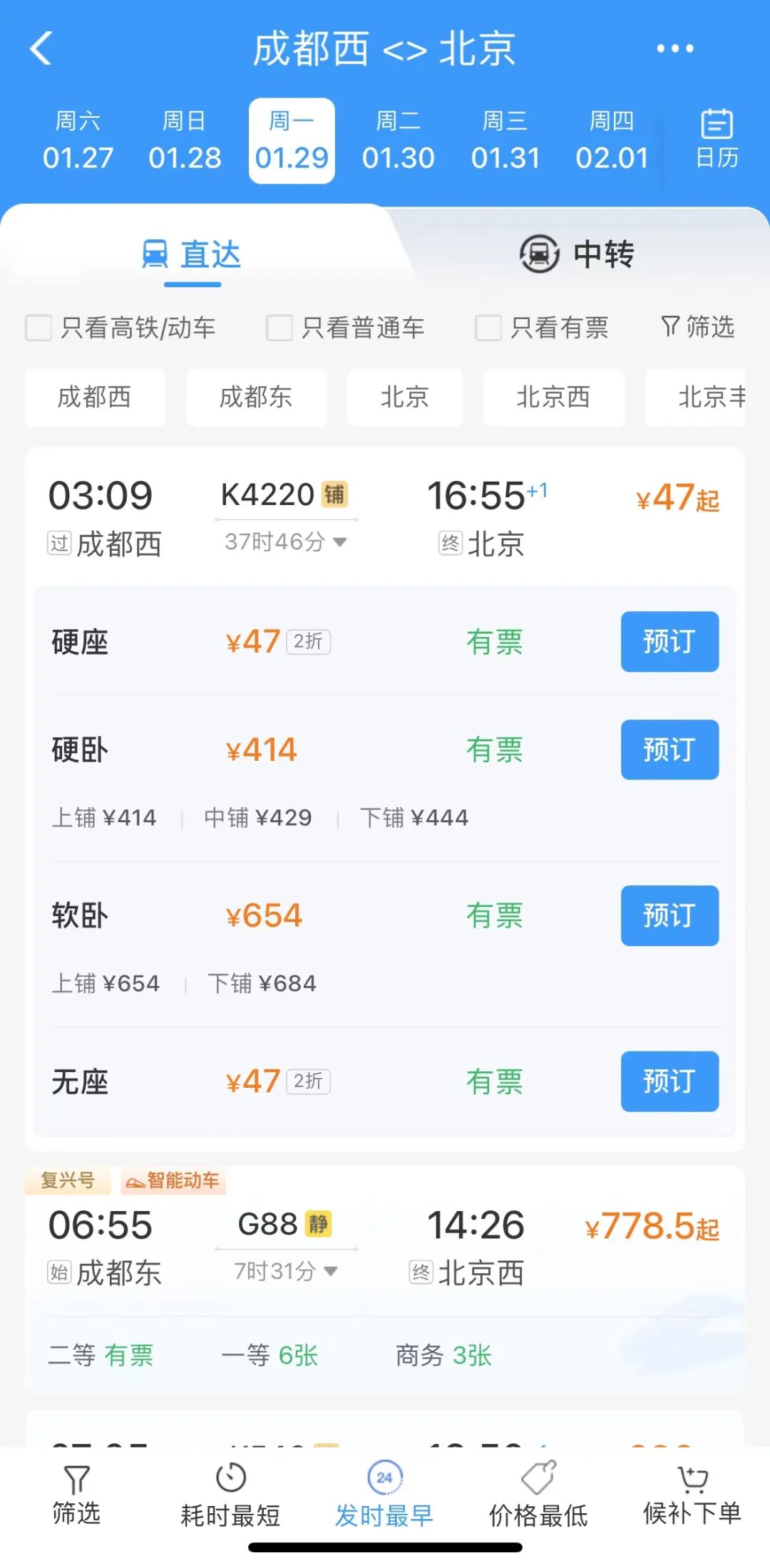 据央视新闻报道,春运火车票加大优惠力度,普速列车票价最低两折、动车组票价最低三折。1月19日,记者从12306平台查询发现,成都至北京的K4220次列车,春运期间硬座票价执行全价的2折,乘客支付47元就可以从成都西站坐到北京站。