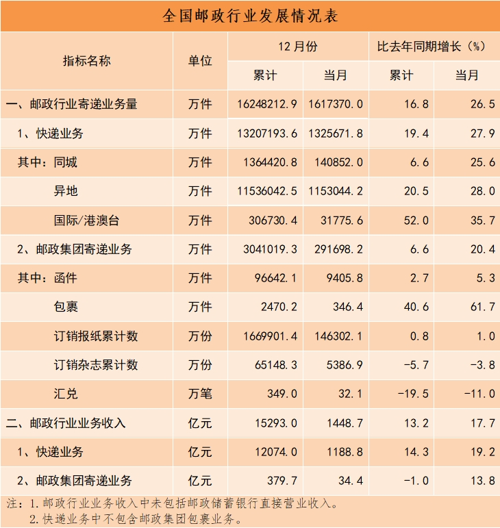 12月份,邮政行业寄递业务量完成161.7亿件,同比增长26.5%。其中,快递业务量完成132.6亿件,同比增长27.9%。