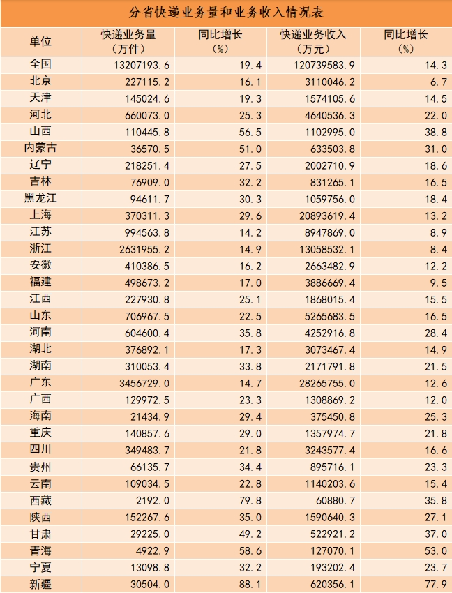 12月份,邮政行业业务收入完成1448.7亿元,同比增长17.7%。其中,快递业务收入完成1188.8亿元,同比增长19.2%。