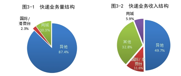 2023年,同城、异地、国际/港澳台快递业务量分别占全部快递业务量的10.3%、87.4%和2.3%;业务收入分别占全部快递收入的5.9%、49.7%和11.6%。与去年同期相比,同城快递业务量的比重下降1.3个百分点,异地快递业务量的比重上升0.8个百分点,国际/港澳台业务量的比重上升0.5个百分点。