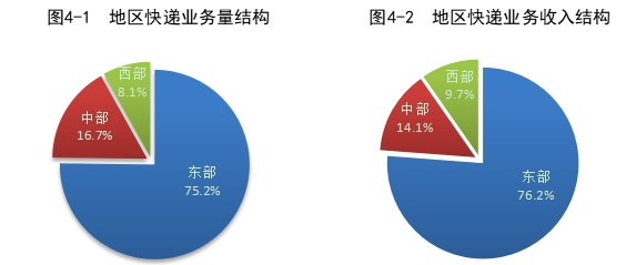 2023年,东、中、西部地区快递业务量比重分别为75.2%、16.7%和8.1%,业务收入比重分别为76.2%、14.1%和9.7%。与去年同期相比,东部地区快递业务量比重下降1.6个百分点,快递业务收入比重下降1.4个百分点;中部地区快递业务量比重上升1.0个百分点,快递业务收入比重上升0.7个百分点;西部地区快递业务量比重上升0.6个百分点,快递业务收入比重上升0.7个百分点。