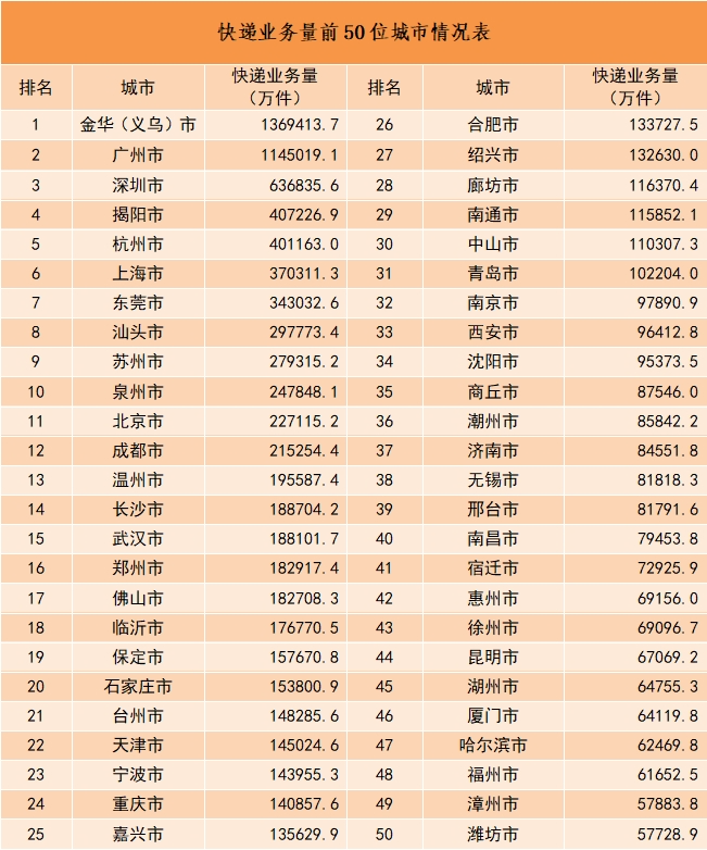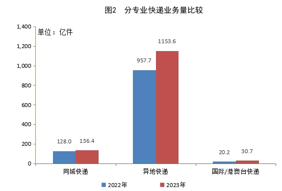 2023年,同城快递业务量累计完成136.4亿件,同比增长6.6%;异地快递业务量累计完成1153.6亿件,同比增长20.5%;国际/港澳台快递业务量累计完成30.7亿件,同比增长52.0%。