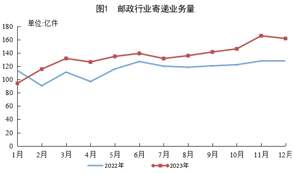 2023年,邮政行业寄递业务量累计完成1624.8亿件,同比增长16.8%。其中,快递业务量(不包含邮政集团包裹业务)累计完成1320.7亿件,同比增长19.4%。