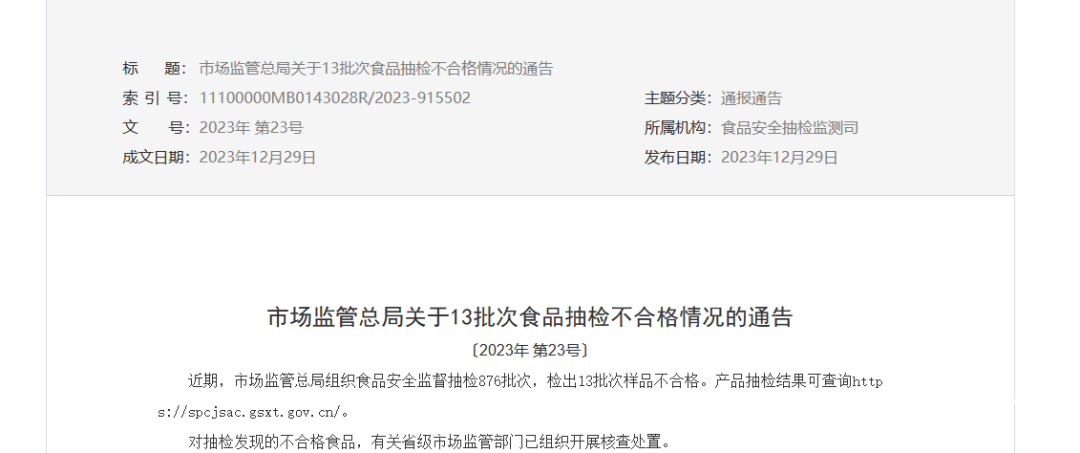 国家市场监管总局近日公布了13批次食品抽检不合格情况的通告。