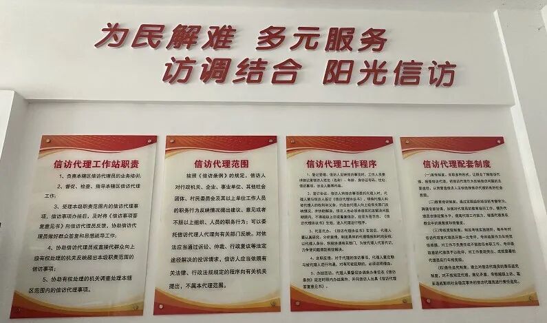 实行成员轮流接访制度,让来访群众“话有地方说、理有地方讲、事有人解决”。同时实行“网格内对接、点对点服务”制度,群众只需要反映信访诉求,剩下的代办员便全程代办,并把最终结果及时反馈给当事人。