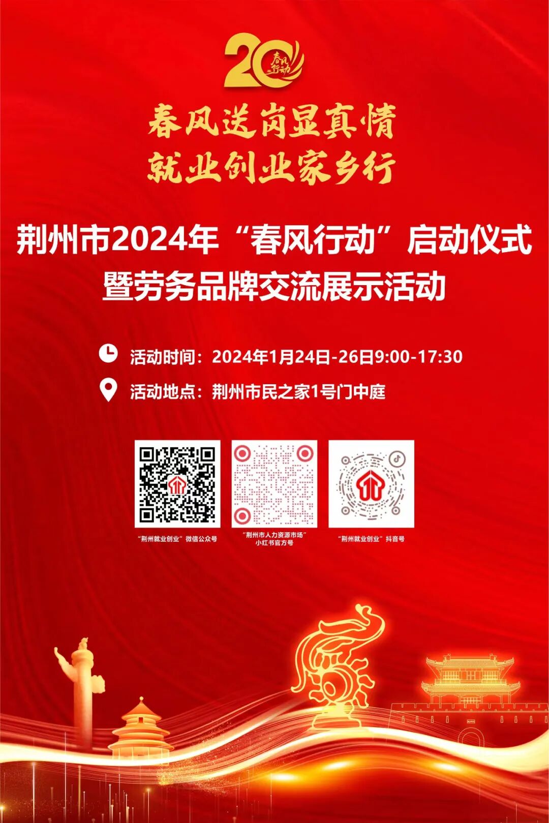 1月24日-26日,荆州市将在市民之家举行2024年“春风送岗显真情 就业创业家乡行”“春风行动”启动仪式。本次活动预计有162家用工企业参加,届时将提供593个岗位,招聘5293人。活动期间,将同步展示劳务品牌创建成果。