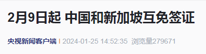 据央视新闻客户端消息,1月25日,中华人民共和国政府和新加坡共和国政府代表在北京签署《中华人民共和国政府与新加坡共和国政府关于互免持普通护照人员签证协定》。协定将于2024年2月9日(农历除夕)正式生效。届时,双方持普通护照人员可免签入境对方国家从事旅游、探亲、商务等私人事务,停留不超过30日。入境对方国家从事工作、新闻报道等须事先批准的活动以及拟在对方国家停留超过30日的,须在入境对方国家前办妥相应签证。