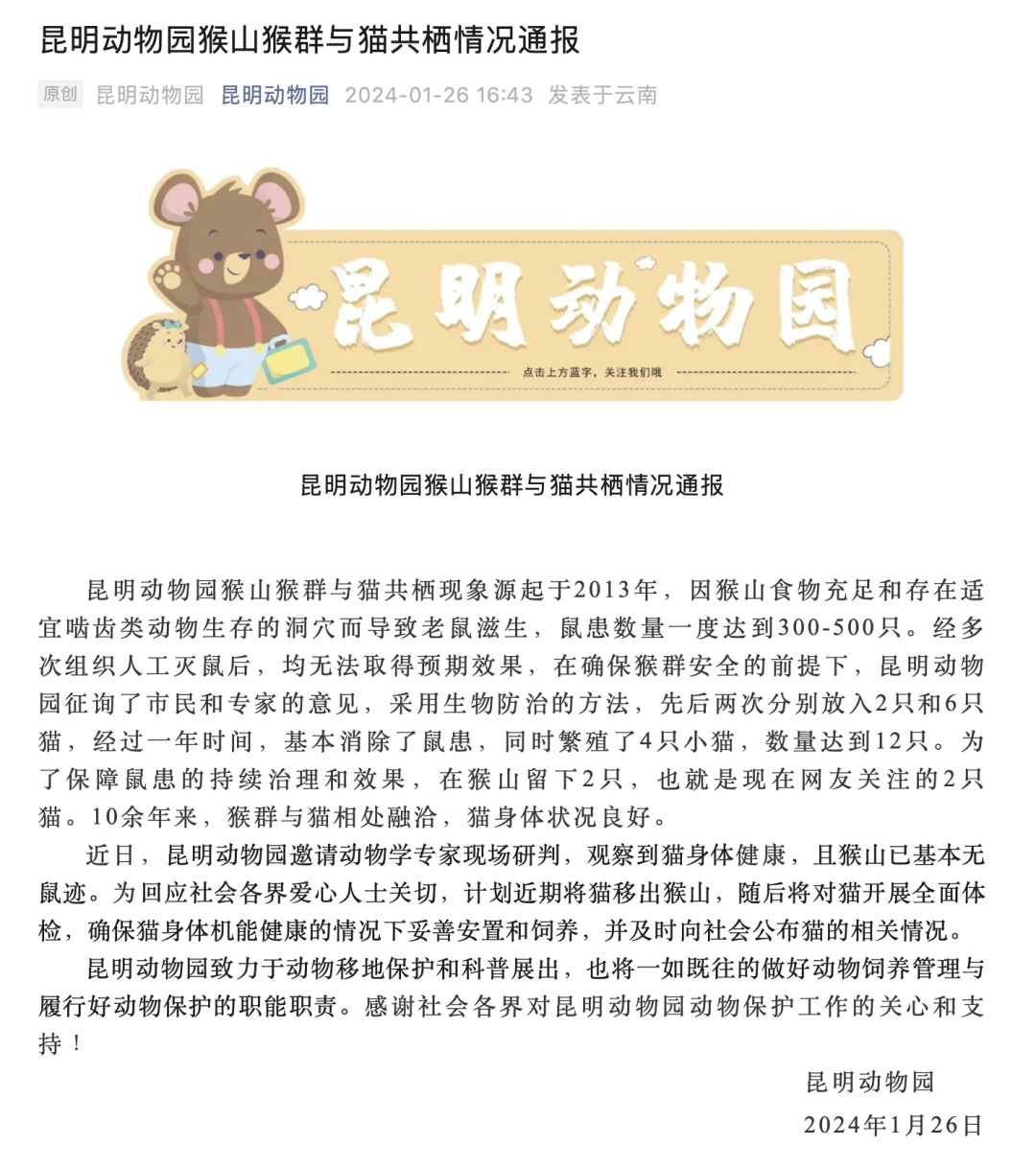 1月19日,昆明动物园也曾就猴山猴群与猫共处发布说明。昆明动物园表示,猫与猴群已融洽相处多年,未发生互相伤害现象,据观察,个别猕猴还有为猫理毛发、抓虱子的共处行为,有的猫生活条件得到改善后,还在猴山上繁衍了后代,后代也从小和猴群能和谐共处。猴山里的猫背毛光亮,健康状况良好,网民反映的问题系动物之间的嬉戏互动行为,不存在虐待行为。
