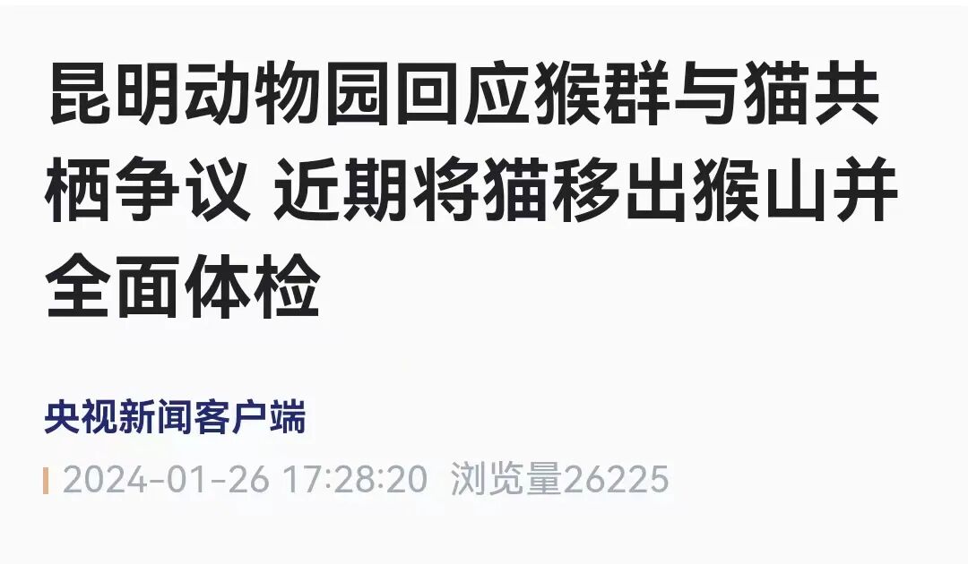 近日,昆明动物园把猫和猴子关在一起引发关注,网友质疑动物园此举会导致猴子虐待猫。今天,昆明动物园发布猴山猴群与猫共栖情况通报。