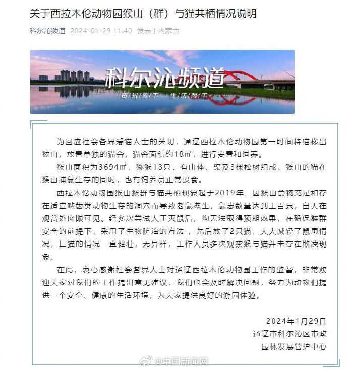 通辽市科尔沁区市政园林发展管护中心29日发布《关于西拉木伦动物园猴山(群)与猫共栖情况说明》(下称“情况说明”)。情况说明显示,通辽西拉木伦动物园已第一时间将猫移出猴山,且猫的情况一直健壮,无异样,工作人员多次观察猴与猫并未存在欺凌现象。