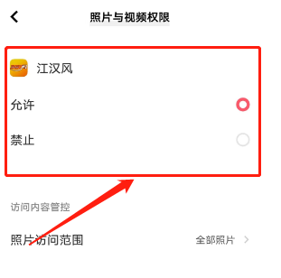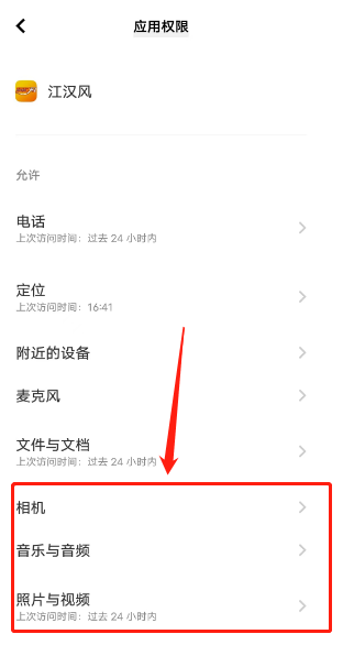 第五步:点开“相机”“音乐与音频”“照片与视频”,将权限设置为允许