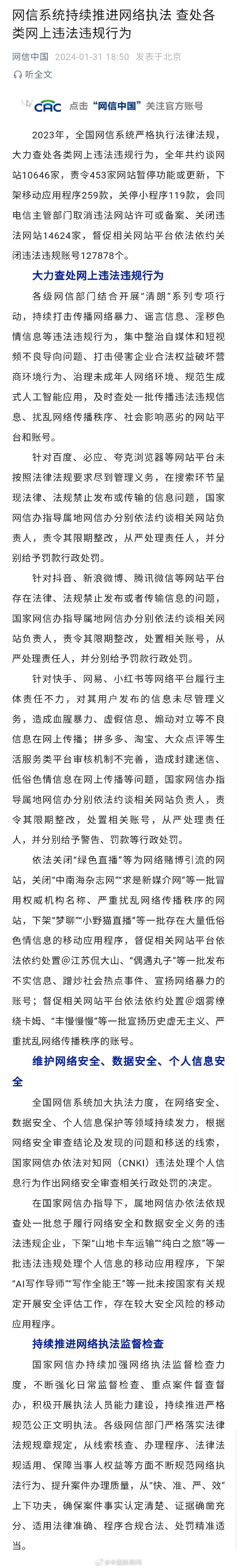 2023年,全国网信系统严格执行法律法规,大力查处各类网上违法违规行为,全年共约谈网站10646家,责令453家网站暂停功能或更新,下架移动应用程序259款,关停小程序119款,会同电信主管部门取消违法网站许可或备案、关闭违法网站14624家,督促相关网站平台依法依约关闭违法违规账号127878个。