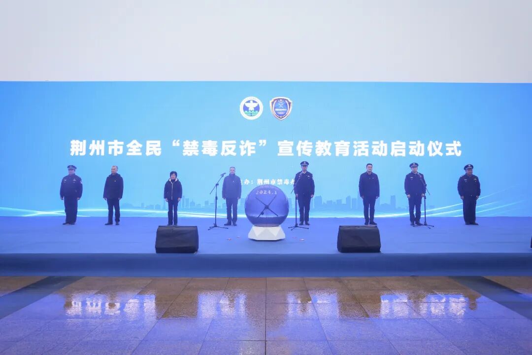 市禁毒委成员单位代表、社区干部代表、群众代表发言,禁毒反诈志愿者代表宣读“倡议书”,现场近千人参加活动。受邀领导集体上前共同按下仪式启动球,2024年荆州市全民“禁毒反诈”宣传教育活动正式开启。